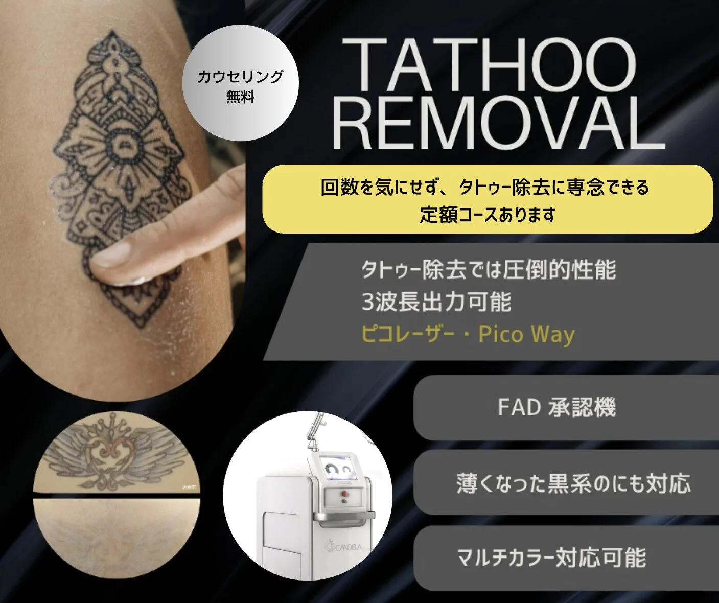 さまざまなタトゥー・刺青の除去に対応するには、ピコレーザーであり、3種類の波長のレーザーが出せることが、タトゥー除去には大切です。